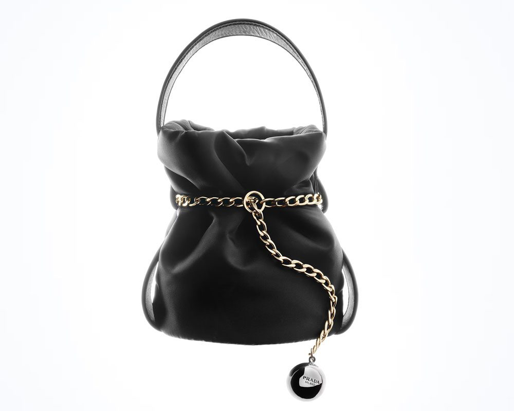 Эта миниатюрная сумка с верхней ручкой вышла на подиум в культовом Prada Re-Nylon и мгновенно привлекла внимание цепочкой с шаром — деталью, которая добавляет дерзости даже в самый сдержанный образ. А для тех, кто предпочитает классику с изюминкой, доступны версии из белой и вишнёвой наппа-кожи.